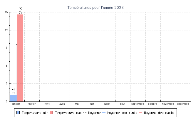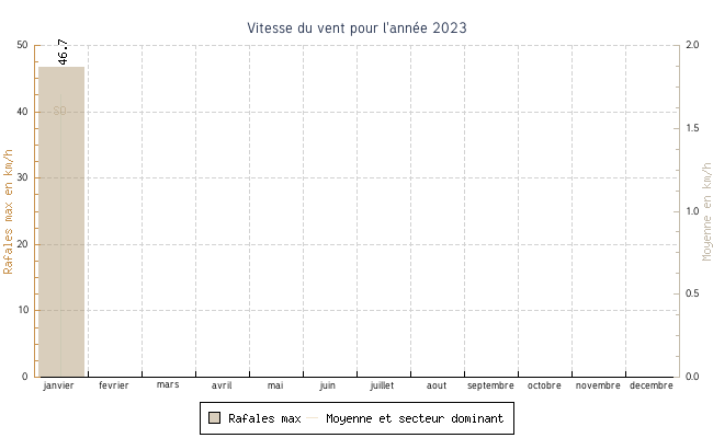 | janvier | 1.1 °C | 7.4 °C | 14.6 °C | 11.6 °C | 9.6 °C | 1.7 km/h | 46.7 km/h | SO |